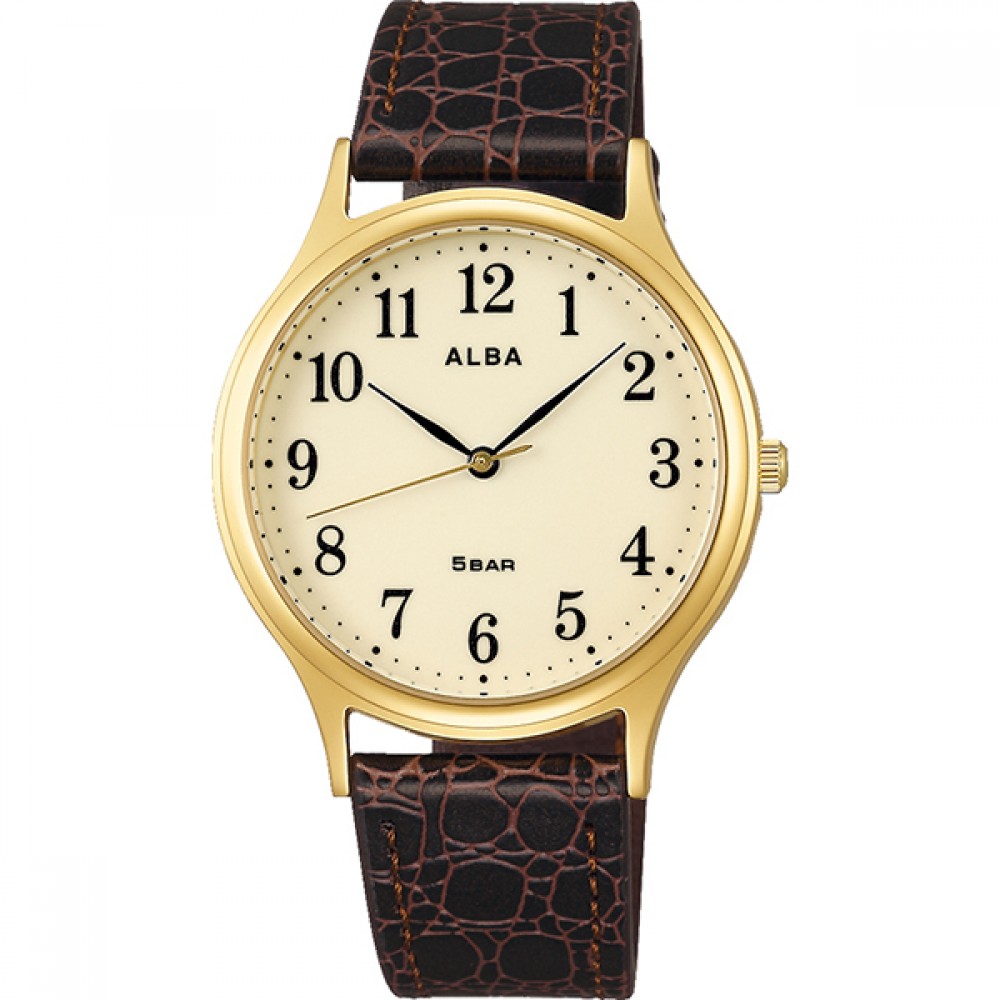 Seiko Alba AQGK458 - men's watch manufactured by Seiko. It is equipped with Japanese quartz movement and VJ21 calibre. Stainless steel, gold plated case of round shape. Case dimensions are 36 mm. in diameter and 7 mm. in thickness. The dial of this Seiko watch is beige. Display type: analog. This timepiece has hardlex glass. Leather band, band color: brown. 50 m. water resistance. The watch is from Alba collection.