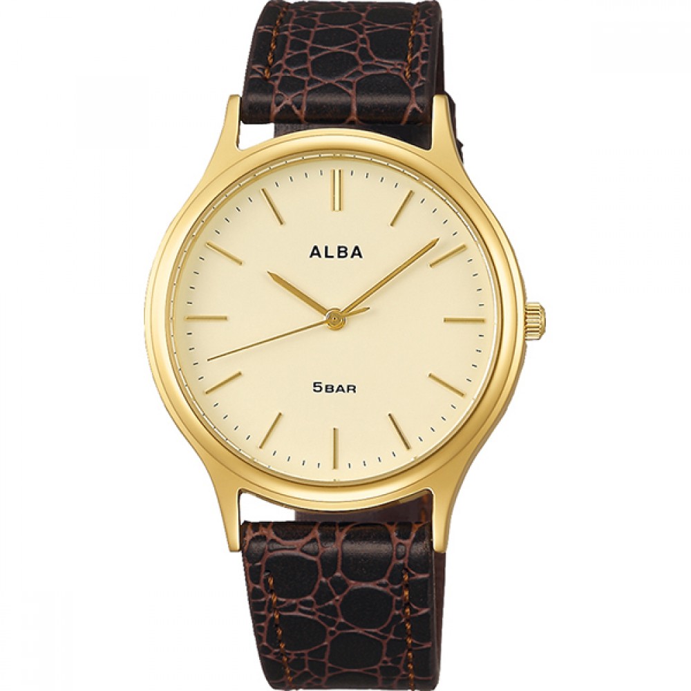 Seiko Alba AQGK462 - men's watch made by Seiko. It has Japanese quartz movement and VJ21 calibre. Stainless steel, gold plated case of round shape. Case dimensions are 36 mm. in diameter and 7 mm. in thickness. The dial of this Seiko watch is beige. Display type: analog. This timepiece has hardlex glass. Leather band, band color: brown. 50 m. water resistance. The watch is from Alba collection.