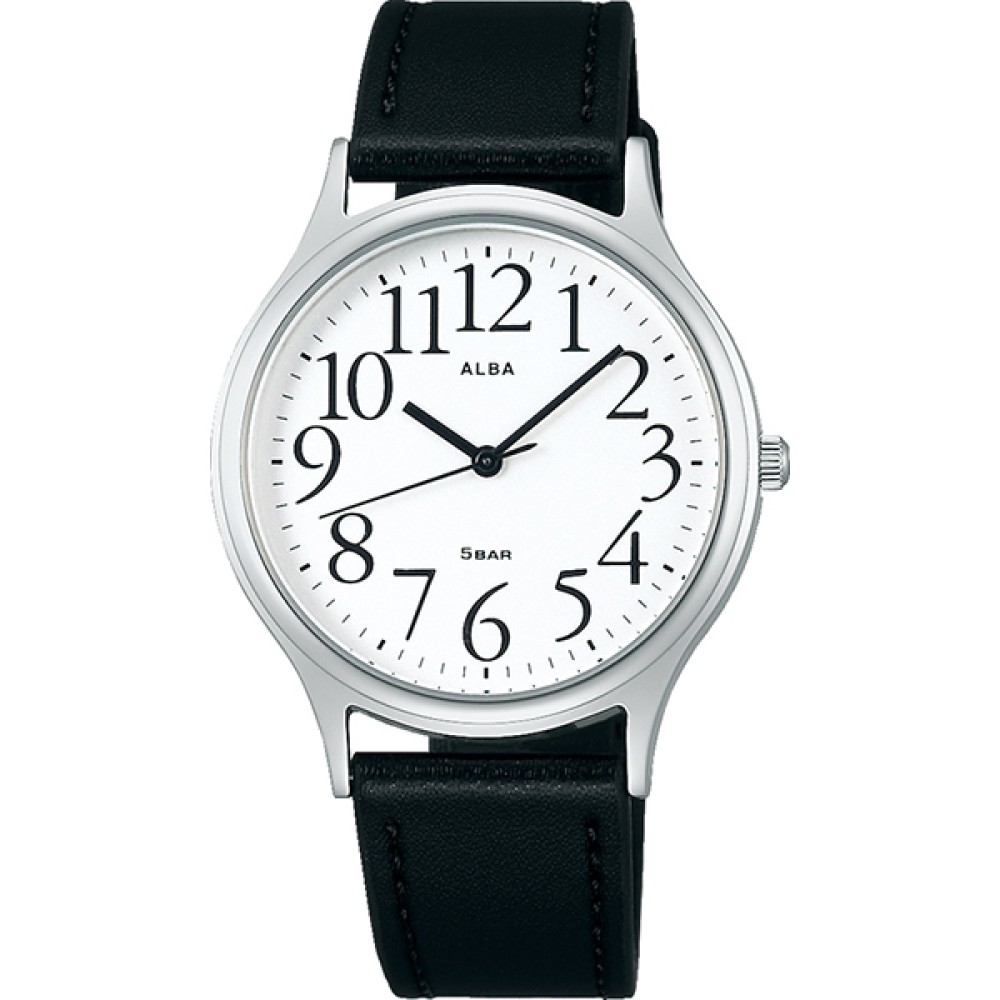 Seiko Alba AQGK464 - men's watch produced by Seiko. It is equipped with Japanese quartz movement and VJ21 calibre. Stainless steel case of round shape. Case dimensions are 36 mm. in diameter and 7 mm. in thickness. The dial of this Seiko watch is white. Display type: analog. This timepiece has hardlex glass. Leather band, band color: black. 50 m. water resistance. The watch is from Alba collection.
