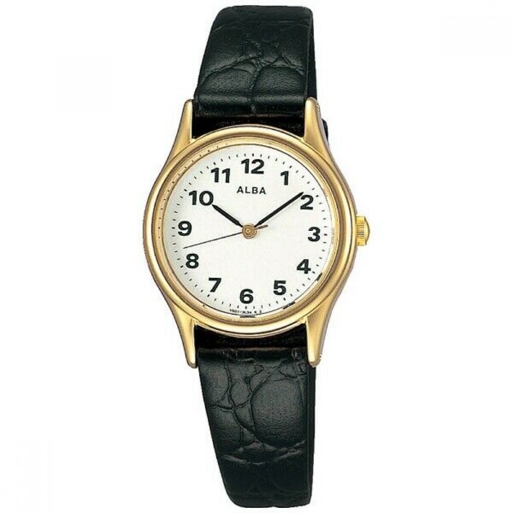 Seiko Alba AQHK420 - ladies watch manufactured by Seiko. It has Japanese quartz movement and VJ21 calibre. Stainless steel, gold plated case of round shape. Case dimensions are 26 mm. in diameter and 7.3 mm. in thickness. The dial of this Seiko watch is white. Display type: analog. This timepiece has hardlex glass. Leather band, band color: black. 30 m. water resistance. The watch is from Alba collection.