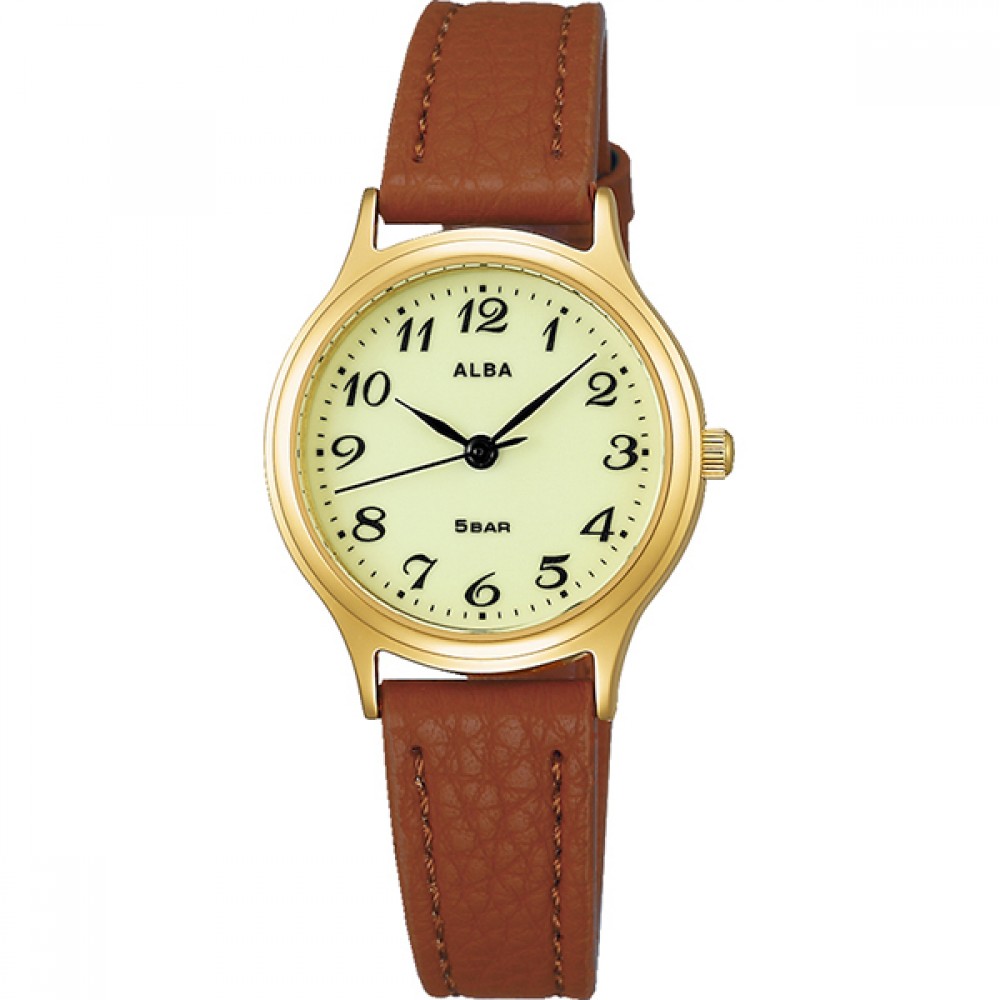 Seiko Alba AQHK441 - ladies watch produced by Seiko. It has Japanese quartz movement and VJ21 calibre. Stainless steel, gold plated case of round shape. Case dimensions are 26.6 mm. in diameter and 7 mm. in thickness. The dial of this Seiko watch is green. Display type: analog. This timepiece has hardlex glass. Leather band, band color: brown. 50 m. water resistance. The watch is from Alba collection.
