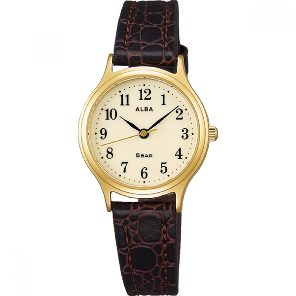 Seiko Alba AQHK442 - ladies watch manufactured by Seiko. It is equipped with Japanese quartz movement and VJ21 calibre. Stainless steel, gold plated case of round shape. Case dimensions are 26.6 mm. in diameter and 7 mm. in thickness. The dial of this Seiko watch is beige. Display type: analog. This timepiece has hardlex glass. Leather band, band color: brown. 50 m. water resistance. The watch is from Alba collection.