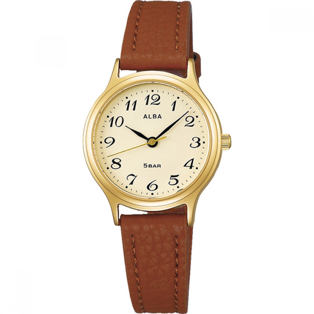 Seiko Alba AQHK443 - ladies watch produced by Seiko. It has Japanese quartz movement and VJ21 calibre. Stainless steel, gold plated case of round shape. Case dimensions are 26.6 mm. in diameter and 7 mm. in thickness. The dial of this Seiko watch is beige. Display type: analog. This timepiece has hardlex glass. Leather band, band color: brown. 50 m. water resistance. The watch is from Alba collection.