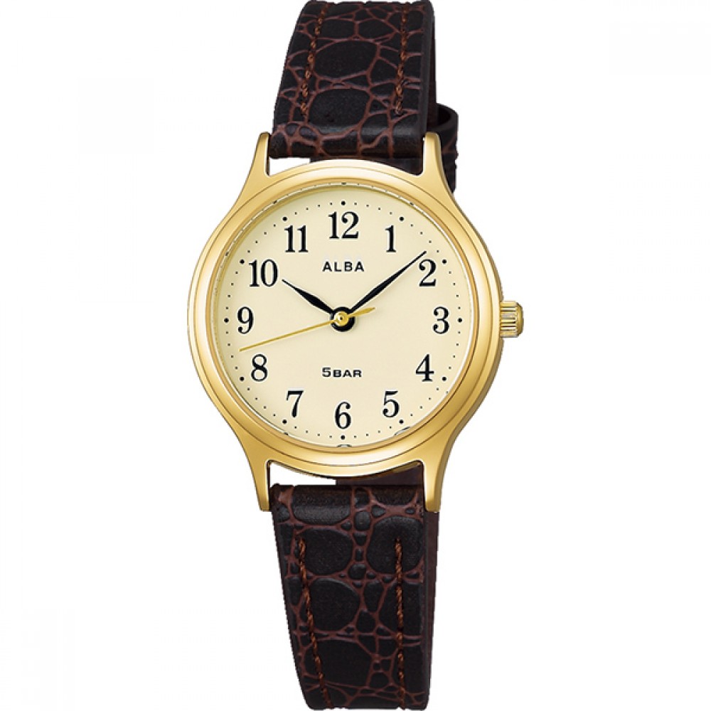 Seiko Alba AQHK444 - ladies watch produced by Seiko. It has Japanese quartz movement and VJ21 calibre. Stainless steel, gold plated case of round shape. Case dimensions are 26.6 mm. in diameter and 7 mm. in thickness. The dial of this Seiko watch is beige. Display type: analog. This timepiece has hardlex glass. Leather band, band color: brown. 50 m. water resistance. The watch is from Alba collection.