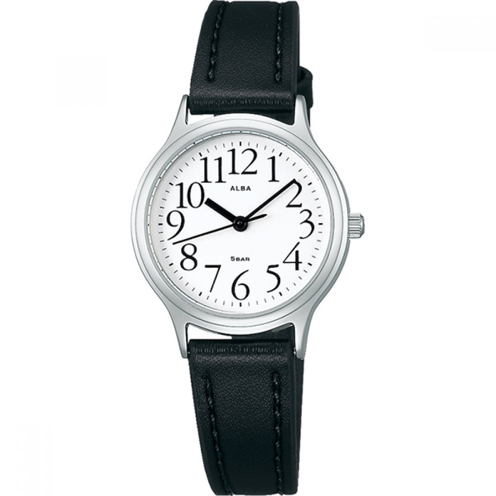Seiko Alba AQHK447 - ladies watch made by Seiko. It has Japanese quartz movement and VJ21 calibre. Stainless steel case of round shape. Case dimensions are 26.6 mm. in diameter and 7 mm. in thickness. The dial of this Seiko watch is white. Display type: analog. This timepiece has mineral glass. Leather band, band color: black. 50 m. water resistance. The watch is from Alba collection.