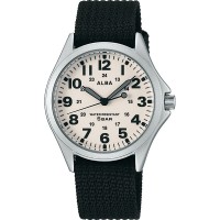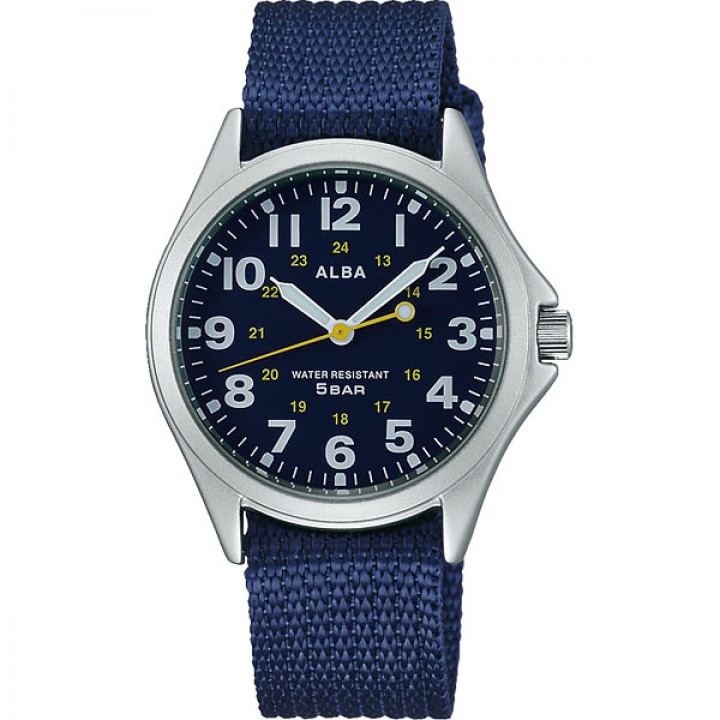 Seiko Alba AQPK402 - men's watch manufactured by Seiko. It has Japanese quartz movement and VJ21 calibre. Brass, palladium plated case of round shape. Case dimensions are 35.5 mm. in diameter and 7.8 mm. in thickness. The dial of this Seiko watch is blue. Display type: analog. This timepiece has hardlex glass. Fabric band, band color: blue. 50 m. water resistance. The watch is from Alba collection. The following features are equipped: glowing hands, glowing markers.