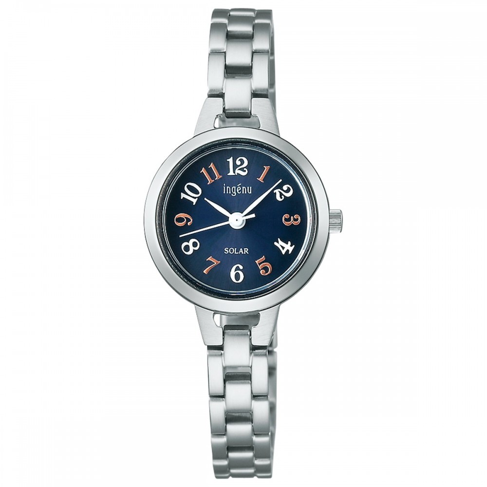 Seiko Alba Ingénue AHJD427 - ladies watch made by Seiko. It is equipped with Japanese solar quartz movement and V117 calibre. Stainless steel case of round shape. Case dimensions are 24 mm. in diameter and 7.2 mm. in thickness. The dial of this Seiko watch is navy. Display type: analog. This timepiece has hardlex glass. Stainless steel band, band color: silver. 50 m. water resistance. The watch is from Alba collection.