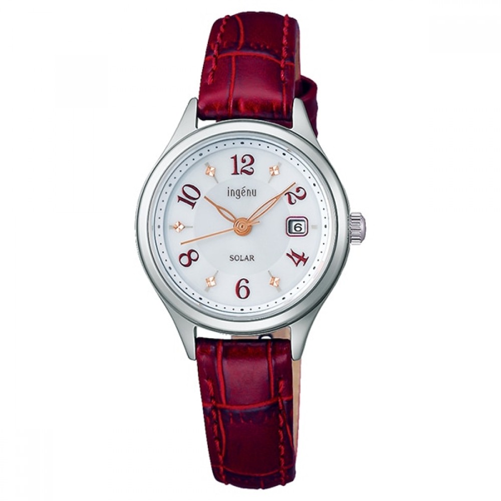 Seiko Alba Ingénue AHJD433 - ladies watch made by Seiko. It has Japanese solar quartz movement and V137 calibre. Stainless steel case of round shape. Case dimensions are 27.1 mm. in diameter and 8.5 mm. in thickness. The dial of this Seiko watch is white. Display type: analog. This timepiece has sapphire glass. Leather band, band color: red. 50 m. water resistance. The watch is from Alba collection. The following features are equipped: date.