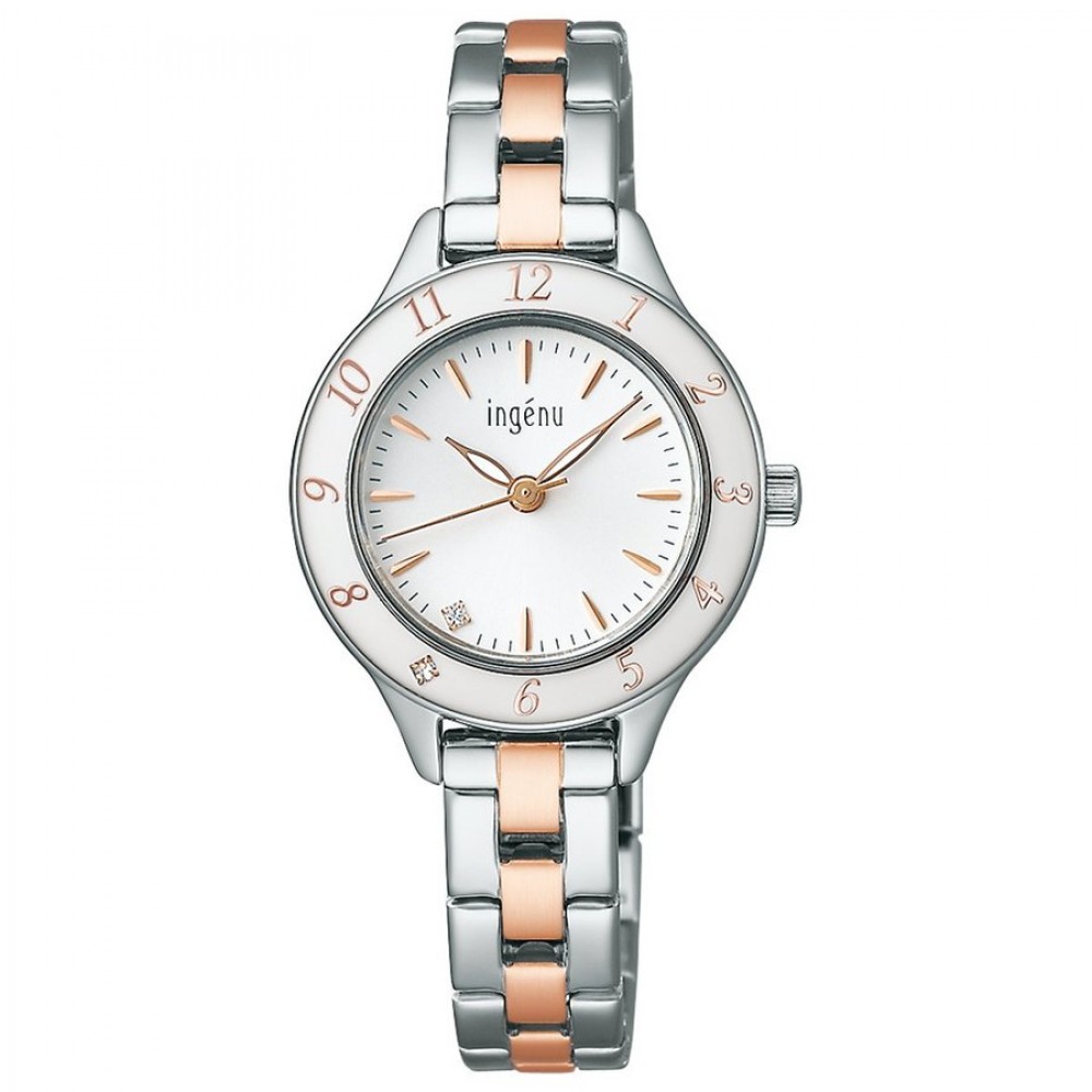 Seiko Alba Ingénue AHJK461 - ladies watch made by Seiko. It is equipped with Japanese quartz movement and VJ21 calibre. Stainless steel case of round shape. Case dimensions are 27.3 mm. in diameter and 7.3 mm. in thickness. The dial of this Seiko watch is white. Display type: analog. This timepiece has mineral glass. Stainless steel, gold plated band, band color: gold, silver. 50 m. water resistance. The watch is from Alba collection. The following features are equipped: crystal set.