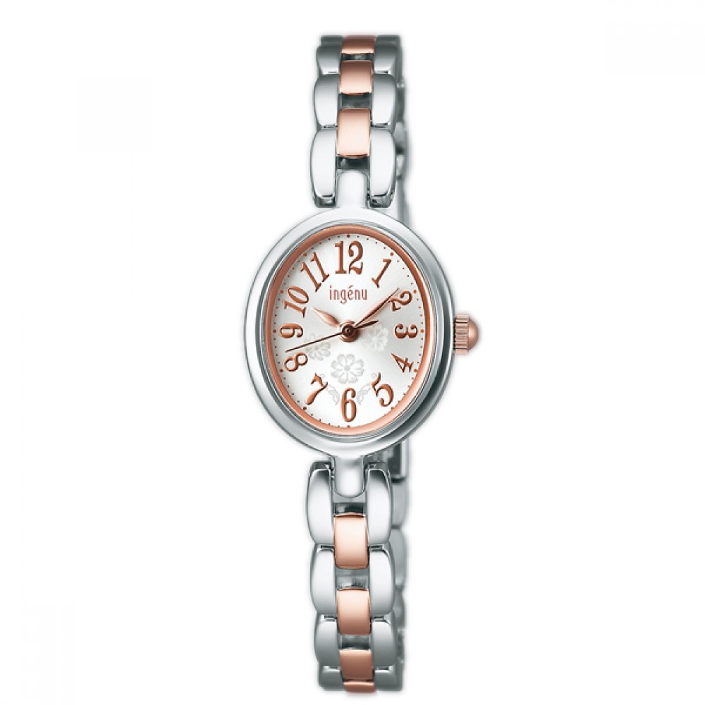 Seiko Alba ingenu AHJK401 - ladies watch produced by Seiko. It has Japanese quartz movement and VX51 calibre. Stainless steel case of oval shape. Case dimensions are 19.5 mm. in diameter and 6.6 mm. in thickness. The dial of this Seiko watch is silver. Display type: analog. This timepiece has hardlex glass. Stainless steel, gold plated band, band color: silver, gold. 30 m. water resistance. The watch is from Alba collection.