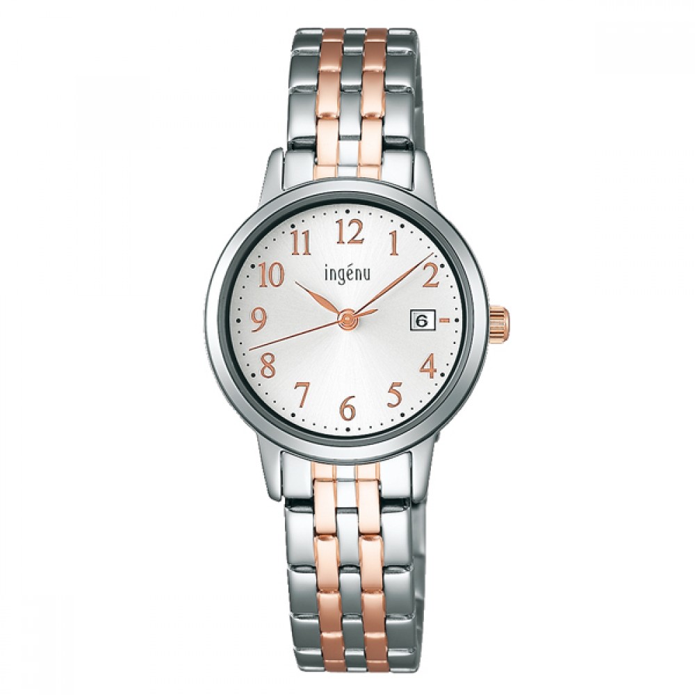 Seiko Alba ingenu AHJK435 - ladies watch manufactured by Seiko. It has Japanese quartz movement and VJ22 calibre. Stainless steel case of round shape. Case dimensions are 26.5 mm. in diameter and 7.8 mm. in thickness. The dial of this Seiko watch is white, silver. Display type: analog. This timepiece has hardlex glass. Stainless steel, gold plated band, band color: silver, gold. 50 m. water resistance. The watch is from Alba collection. The following features are equipped: date.