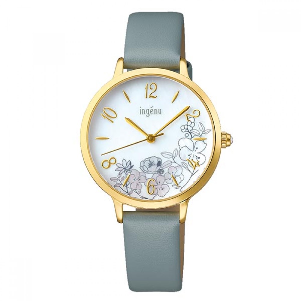 Seiko Alba ingenu AHJK452 - ladies watch produced by Seiko. It is equipped with Japanese quartz movement and VJ21 calibre. Stainless steel, gold plated case of round shape. Case dimensions are 30 mm. in diameter and 7.3 mm. in thickness. The dial of this Seiko watch is mother of pearl. Display type: analog. This timepiece has hardlex glass. Leather band, band color: gray. 50 m. water resistance. The watch is from Alba collection. The following features are equipped: crystal set.