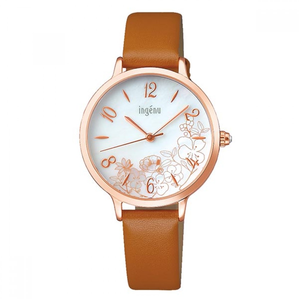 Seiko Alba ingenu AHJK453 - ladies watch produced by Seiko. It is equipped with Japanese quartz movement and VJ21 calibre. Stainless steel, gold plated case of round shape. Case dimensions are 30 mm. in diameter and 7.3 mm. in thickness. The dial of this Seiko watch is mother of pearl. Display type: analog. This timepiece has hardlex glass. Leather band, band color: brown. 50 m. water resistance. The watch is from Alba collection. The following features are equipped: crystal set.