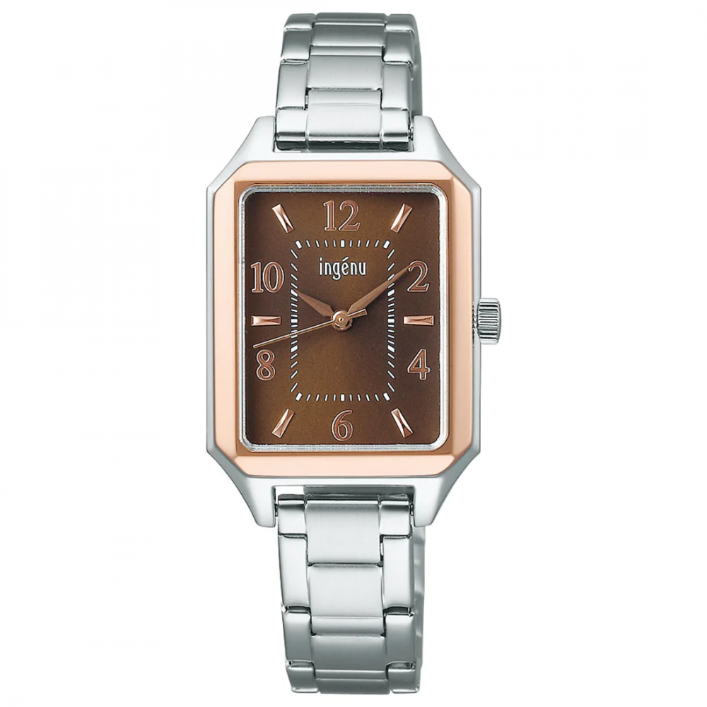 Seiko Alba Ingenu AHJK466 - ladies watch manufactured by Seiko. It is equipped with Japanese quartz movement and VJ21 calibre. Stainless steel, gold plated case of rectangle shape. Case dimensions are 24 mm. in diameter and 7.5 mm. in thickness. The dial of this Seiko watch is brown. Display type: analog. This timepiece has hardlex glass. Stainless steel band, band color: silver. 50 m. water resistance. The watch is from Alba collection.