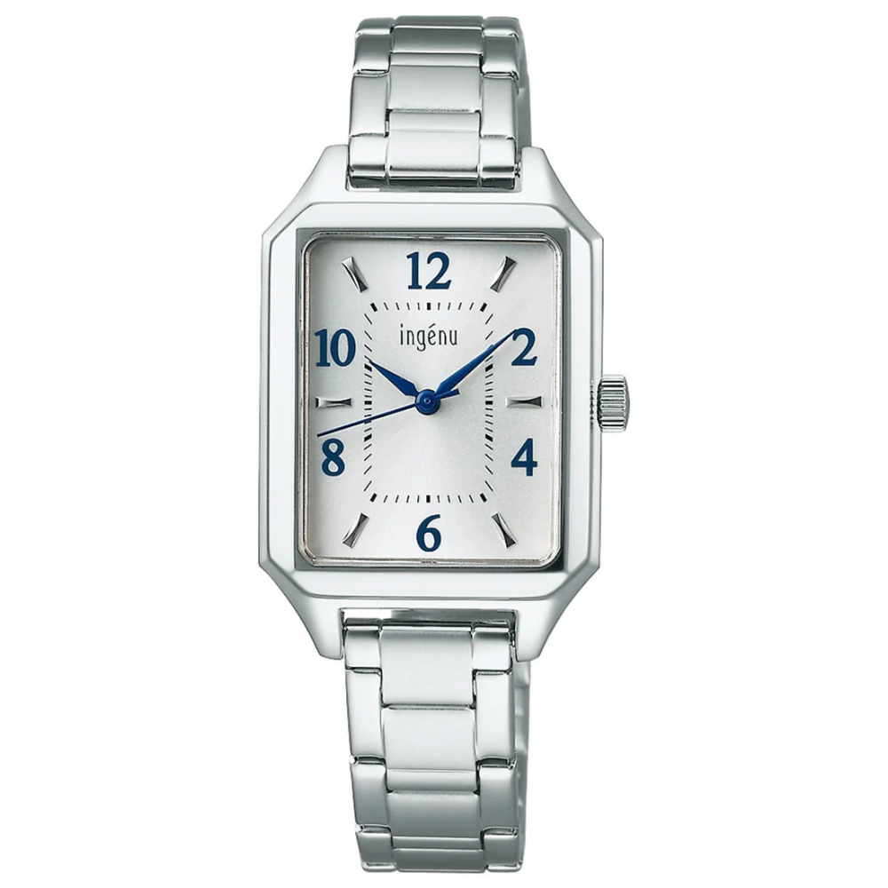 Seiko Alba Ingenu AHJK468 - ladies watch produced by Seiko. It has Japanese quartz movement and VJ21 calibre. Stainless steel case of rectangle shape. Case dimensions are 24 mm. in diameter and 7.5 mm. in thickness. The dial of this Seiko watch is white. Display type: analog. This timepiece has hardlex glass. Stainless steel band, band color: silver. 50 m. water resistance. The watch is from Alba collection.