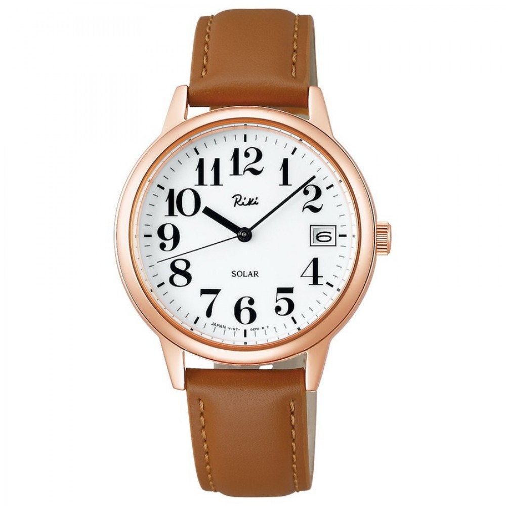 Seiko Alba Riki Watanabe AKPD026 - unisex watch manufactured by Seiko. It has Japanese solar quartz movement and V157 calibre. Stainless steel, gold plated case of round shape. Case dimensions are 35 mm. in diameter and 9.5 mm. in thickness. The dial of this Seiko watch is white. Display type: analog. This timepiece has hardlex glass. Leather band, band color: brown. 50 m. water resistance. The watch is from Alba collection. The following features are equipped: date.