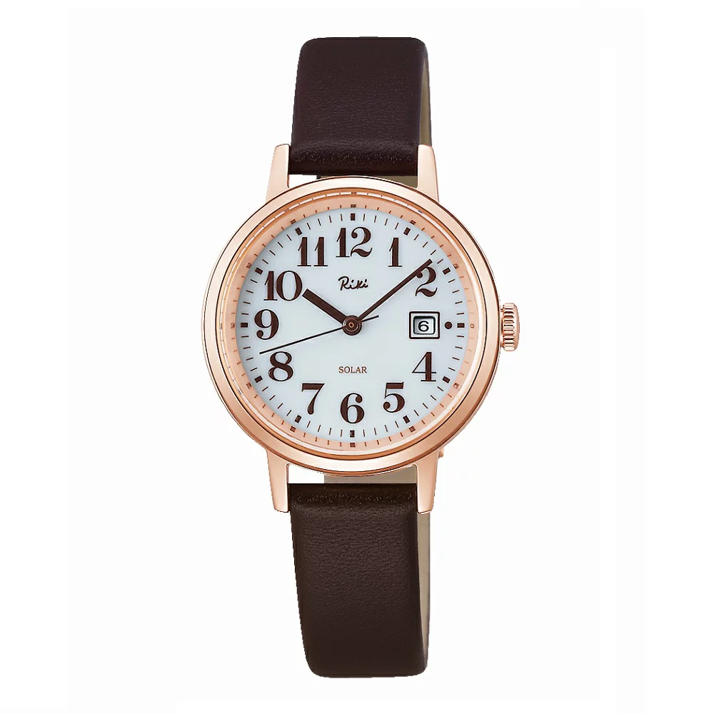 Seiko Alba Riki Watanabe AKQD403 - ladies watch made by Seiko. It is equipped with Japanese solar quartz movement and V137 calibre. Stainless steel, gold plated case of round shape. Case dimensions are 28 mm. in diameter and 7.8 mm. in thickness. The dial of this Seiko watch is white. Display type: analog. This timepiece has hardlex glass. Leather band, band color: brown. 50 m. water resistance. The watch is from Alba collection. The following features are equipped: date.