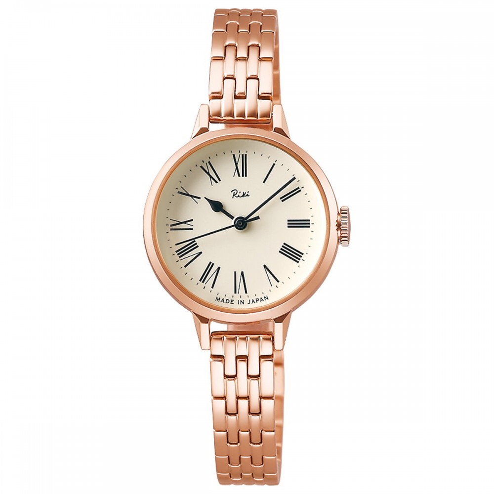 Seiko Alba Riki Watanabe AKQK032 - ladies watch manufactured by Seiko. It is equipped with Japanese quartz movement and VJ21 calibre. Stainless steel, gold plated case of round shape. Case dimensions are 25 mm. in diameter and 7.8 mm. in thickness. The dial of this Seiko watch is beige. Display type: analog. This timepiece has hardlex glass. Stainless steel, gold plated band, band color: gold. 30 m. water resistance. The watch is from Alba collection.