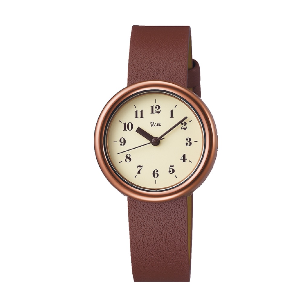 Seiko Alba Riki Watanabe AKQK450 - ladies watch made by Seiko. It is equipped with Japanese quartz movement and VC01 calibre. Stainless steel, hard coating case of round shape. Case dimensions are 28.9 mm. in diameter and 7.2 mm. in thickness. The dial of this Seiko watch is beige. Display type: analog. This timepiece has hardlex glass. Leather band, band color: brown. 30 m. water resistance. The watch is from Alba collection.