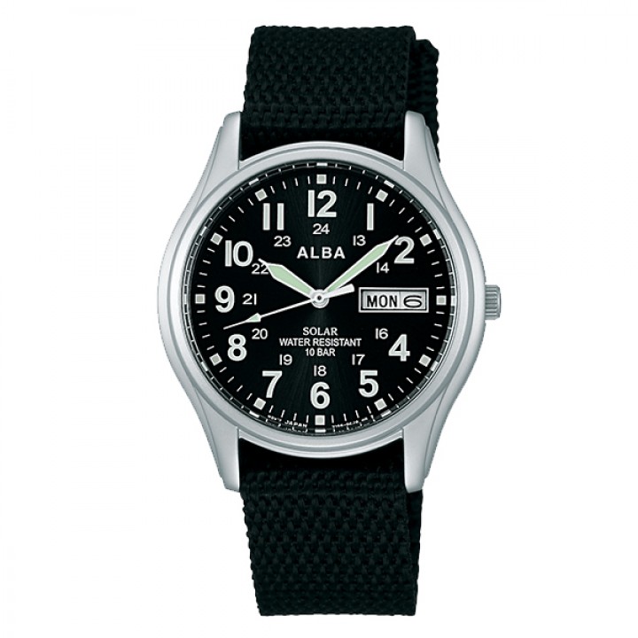 Seiko Alba Solar AEFD557 - men's watch made by Seiko. It has Japanese solar quartz movement and V158 calibre. Stainless steel case of round shape. Case dimensions are 36.4 mm. in diameter and 9.3 mm. in thickness. The dial of this Seiko watch is black. Display type: analog. This timepiece has hardlex glass. Fabric band, band color: black. 100 m. water resistance. The watch is from Alba collection. The following features are equipped: date, day, glowing hands, glowing markers.