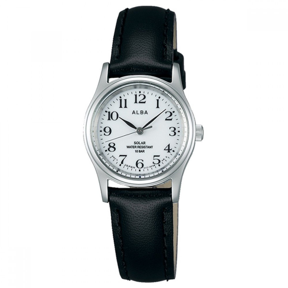 Seiko Alba Solar AEGD543 - ladies watch made by Seiko. It has Japanese solar quartz movement and V117 calibre. Stainless steel case of round shape. Case dimensions are 24.5 mm. in diameter and 7.1 mm. in thickness. The dial of this Seiko watch is white. Display type: analog. This timepiece has hardlex glass. Leather band, band color: black. 100 m. water resistance. The watch is from Alba collection.