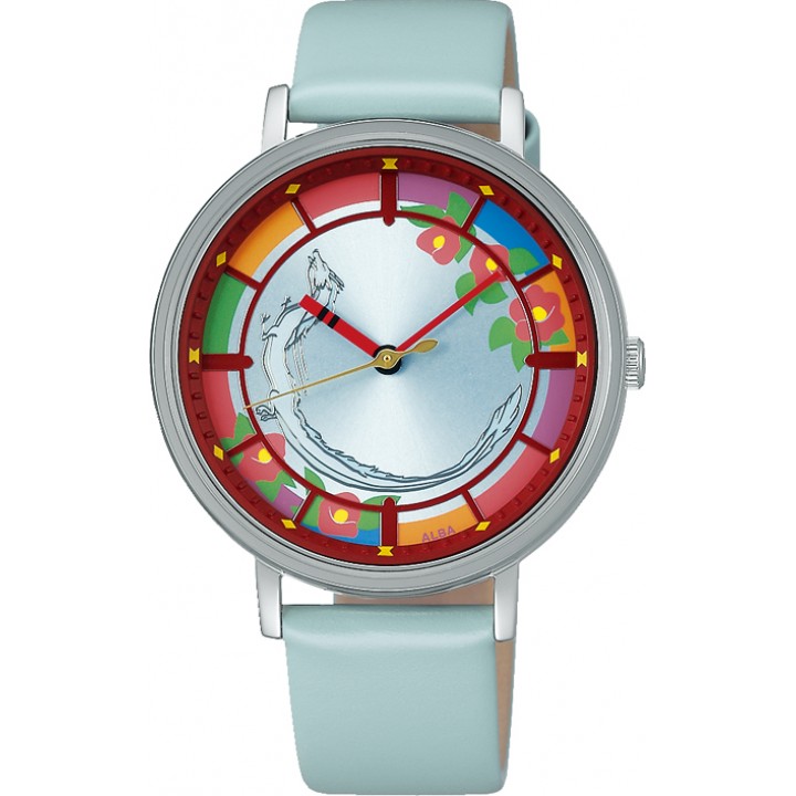 Seiko Alba Spirited Away 20th Anniversary Limited Model ACCK719 - ladies watch produced by Seiko. It is equipped with Japanese quartz movement and VJ21 calibre. Stainless steel case of round shape. Case dimensions are 36 mm. in diameter and 7.6 mm. in thickness. The dial of this Seiko watch is multicolor. Display type: analog. This timepiece has mineral glass. Leather band, band color: blue. 30 m. water resistance. The watch is from Alba collection. The following features are equipped: limited edition.