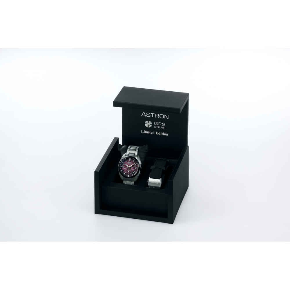 Seiko Astron 2021 Limited Edition SBXC101 - men's watch made by Seiko. It is equipped with Japanese solar quartz movement and 5X53 calibre. Titanium, hard coating case of round shape. Case dimensions are 42.8 mm. in diameter and 14.7 mm. in thickness. The dial of this Seiko watch is purple. Display type: analog. This timepiece has sapphire, super clear coating glass. Titanium, hard coating, polymer band, band color: silver, black. 200 m. water resistance. The watch is from Astron collection. The following features are equipped: antimagnetic, gps, glowing hands, glowing markers, limited edition, dual time, power reserve indicator, perpetual calendar, world time, date, day.