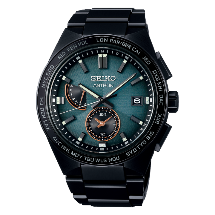 Seiko Astron Nexter 2023 Limited Edition SBXY057 - men's watch made by Seiko. It is equipped with Japanese solar quartz movement and 8B63 calibre. Titanium, hard coating case of round shape. Case dimensions are 42.7 mm. in diameter and 11.4 mm. in thickness. The dial of this Seiko watch is green. Display type: analog. This timepiece has sapphire, super clear coating glass. Titanium, hard coating band, band color: black. 100 m. water resistance. The watch is from Astron collection. The following features are equipped: radio controlled, perpetual calendar, world time, dual time, date, day, antimagnetic, limited edition, screw-down crown, glowing hands, glowing markers.