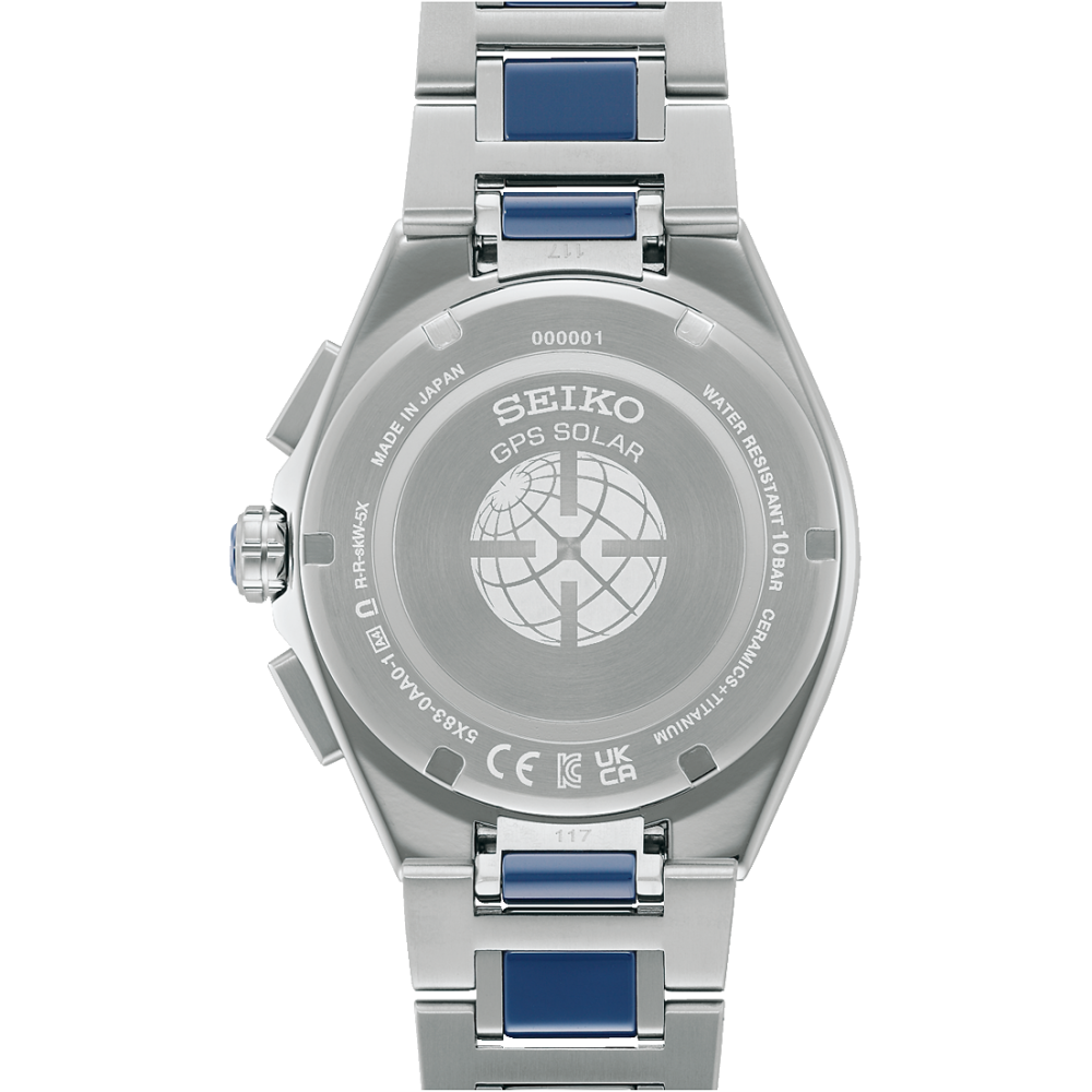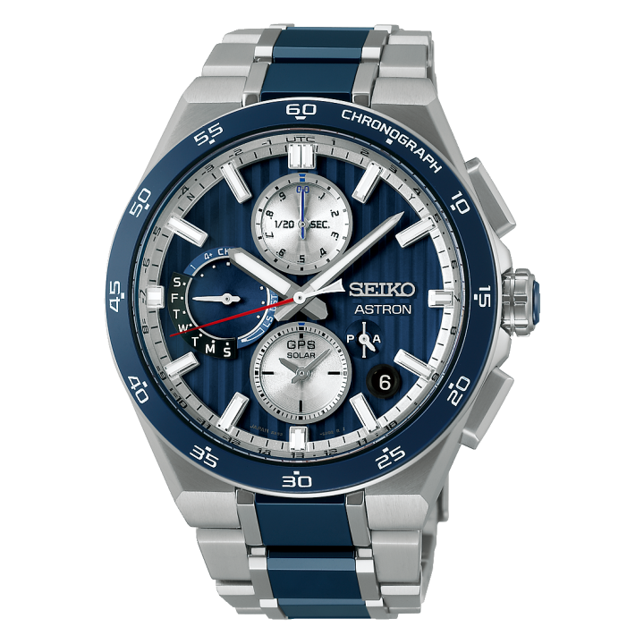 Seiko Astron Nexter GPS Solar SBXC181 - men's watch produced by Seiko. It has Japanese solar quartz movement and 5X83 calibre. Titanium, diamond shield, ceramic case of round shape. Case dimensions are 43.3 mm. in diameter and 13.4 mm. in thickness. The dial of this Seiko watch is blue. Display type: analog. This timepiece has sapphire, super clear coating glass. Titanium, diamond shield band, band color: silver, blue. 100 m. water resistance. The watch is from Astron collection. The following features are equipped: gps, chronograph, perpetual calendar, world time, dual time, date, day, power reserve indicator, antimagnetic, glowing hands, glowing markers.