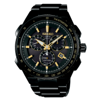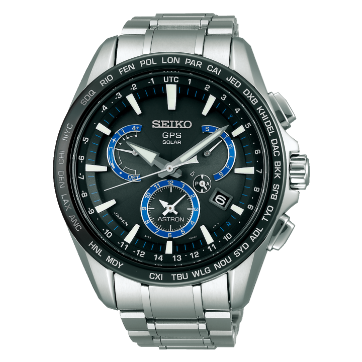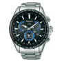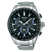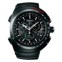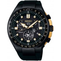 Seiko Astron SBXB107 - men's watch produced by Seiko. It is equipped with Japanese solar quartz movement and 8X53 calibre. Stainless steel, hard coating, ceramic case of round shape. Case dimensions are 45 mm. in diameter and 13.3 mm. in thickness. The dial of this Seiko watch is black. Display type: analog. This timepiece has sapphire, super clear coating glass. Stainless steel, hard coating band, band color: silver. 100 m. water resistance. The watch is from Astron collection. The following features are equipped: date, day, antimagnetic, gps, perpetual calendar, dual time, world time, power reserve indicator, glowing hands, glowing markers.