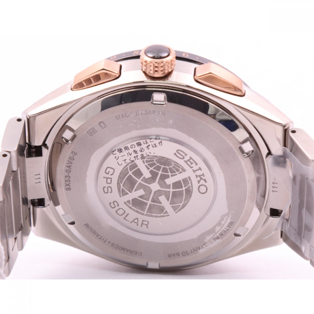 Seiko Astron SBXB125 - men's watch made by Seiko. It has Japanese solar quartz movement and 8X53 calibre. Titanium, hard coating, ceramic case of round shape. Case dimensions are 46.1 mm. in diameter and 14.3 mm. in thickness. The dial of this Seiko watch is black. Display type: analog. This timepiece has sapphire, super clear coating glass. Titanium, hard coating band, band color: silver. 100 m. water resistance. The watch is from Astron collection. The following features are equipped: date, day, gps, antimagnetic, perpetual calendar, world time, power reserve indicator, dual time, glowing hands, glowing markers.