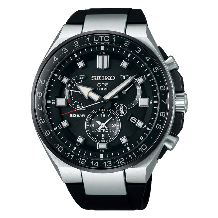 Seiko Astron SBXB169 - men's watch manufactured by Seiko. It has Japanese solar quartz movement and 8X53 calibre. Titanium, hard coating, ceramic case of round shape. Case dimensions are 46.7 mm. in diameter and 14.5 mm. in thickness. The dial of this Seiko watch is black. Display type: analog. This timepiece has sapphire, super clear coating glass. Polymer band, band color: black. 200 m. water resistance. The watch is from Astron collection. The following features are equipped: gps, perpetual calendar, world time, dual time, date, day, power reserve indicator, antimagnetic, glowing hands, glowing markers.