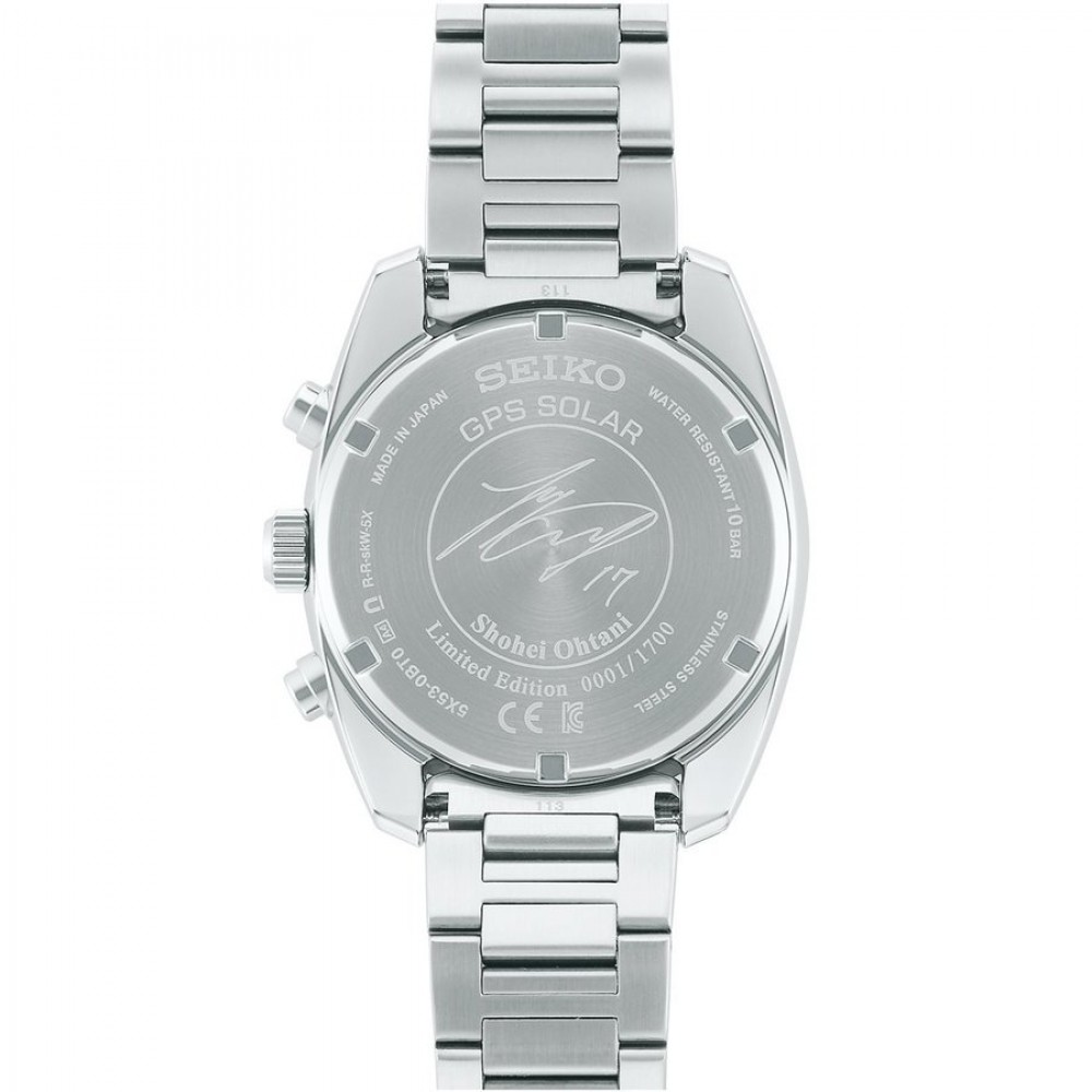 Seiko Astron Shohei Otani 2022 Limited Model SBXC115 - men's watch made by Seiko. It has Japanese solar quartz movement and 5X53 calibre. Stainless steel, hard coating case of round shape. Case dimensions are 42.7 mm. in diameter and 13.3 mm. in thickness. The dial of this Seiko watch is blue. Display type: analog. This timepiece has sapphire glass. Stainless steel band, band color: silver. 100 m. water resistance. The watch is from Astron collection. The following features are equipped: perpetual calendar, world time, dual time, date, day, glowing hands, glowing markers, power reserve indicator, gps, antimagnetic, limited edition.