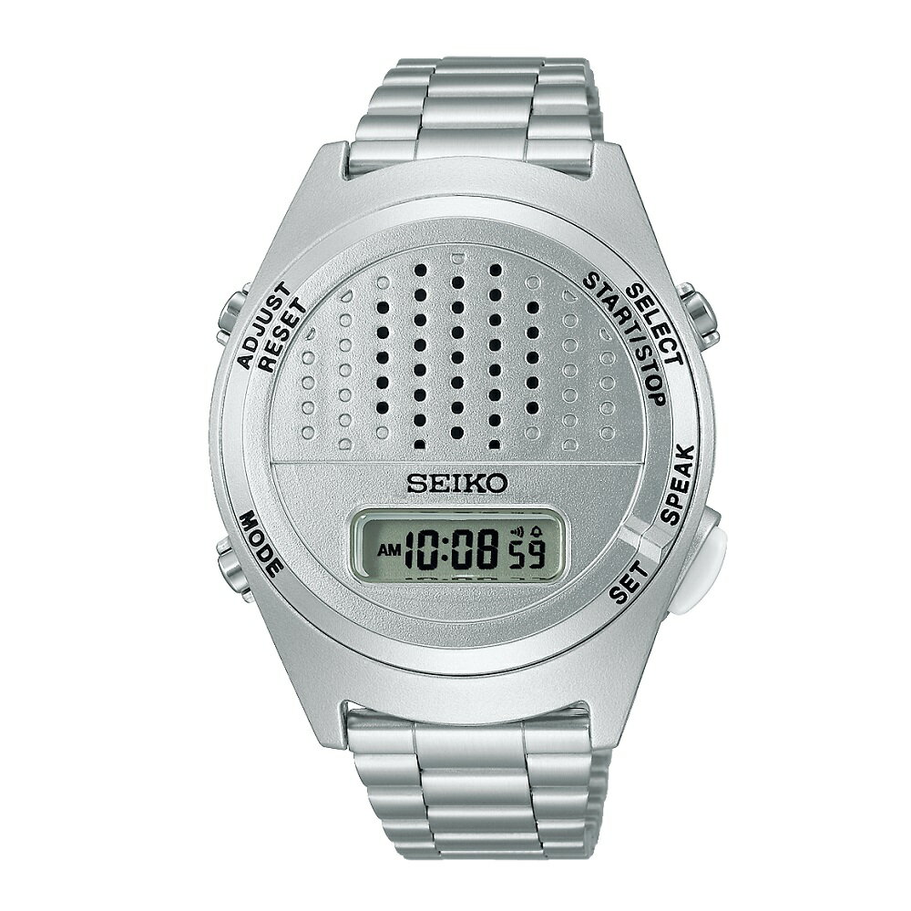 Seiko Audio Digital Watch SBJS013 - unisex watch made by Seiko. It is equipped with Japanese quartz movement and A862 calibre. Polymer case of round shape. Case dimensions are 41 mm. in diameter and 14.1 mm. in thickness. The dial of this Seiko watch is lcd. Display type: digital. This timepiece has hardlex glass. Stainless steel band, band color: silver. m. water resistance. The watch is from Audio Digital collection. The following features are equipped: alarm, chronograph.