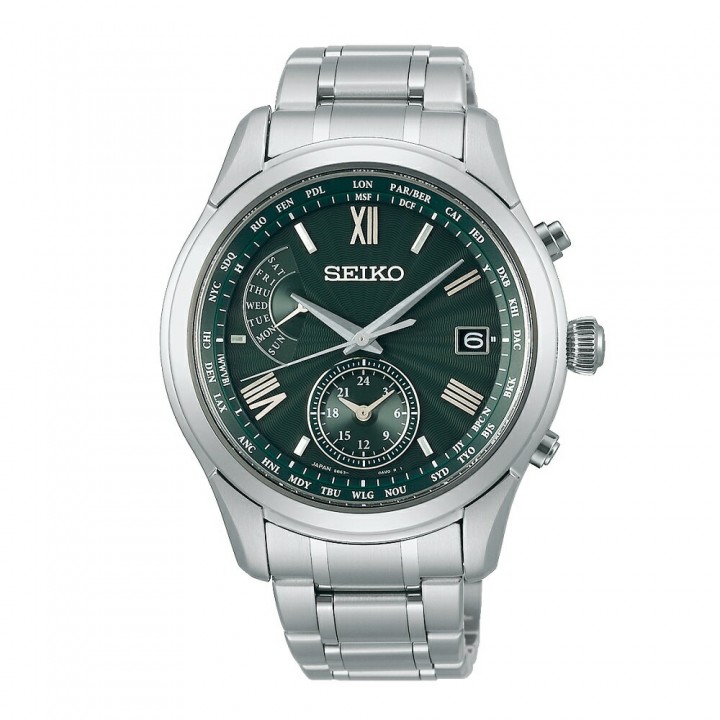 Seiko Brightz SAGA307 - men's watch made by Seiko. It is equipped with Japanese solar quartz movement and 8B63 calibre. Titanium, hard coating case of round shape. Case dimensions are 41.4 mm. in diameter and 10.6 mm. in thickness. The dial of this Seiko watch is green. Display type: analog. This timepiece has sapphire, super clear coating glass. Titanium, hard coating band, band color: silver. 100 m. water resistance. The watch is from Seiko Brightz collection. The following features are equipped: date, day, radio controlled, world time, perpetual calendar, dual time, antimagnetic, screw-down crown.