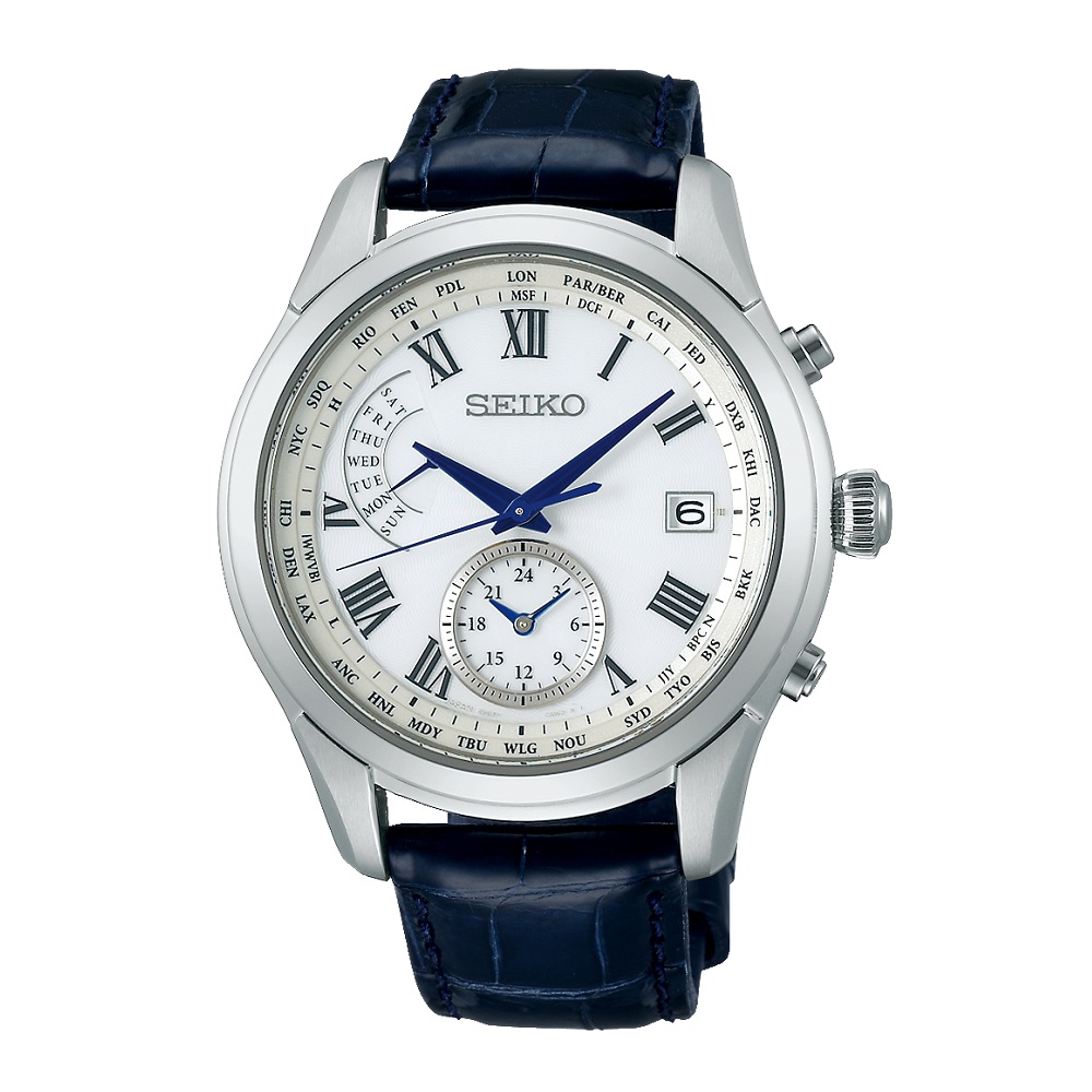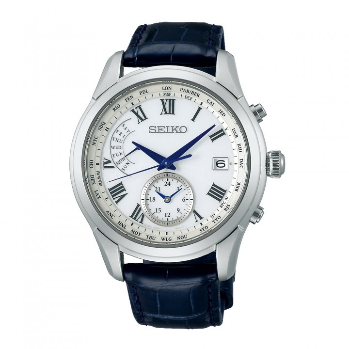 Seiko Brightz SAGA311 - men's watch made by Seiko. It has Japanese solar quartz movement and 8B63 calibre. Titanium, hard coating case of round shape. Case dimensions are 41.4 mm. in diameter and 10.6 mm. in thickness. The dial of this Seiko watch is white. Display type: analog. This timepiece has sapphire, super clear coating glass. Crocodile band, band color: blue. 100 m. water resistance. The watch is from Seiko Brightz collection. The following features are equipped: date, day, radio controlled, world time, perpetual calendar, dual time, antimagnetic, screw-down crown.