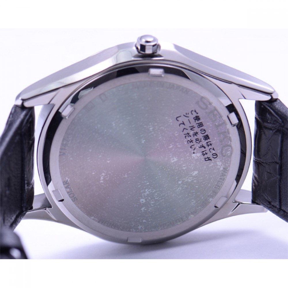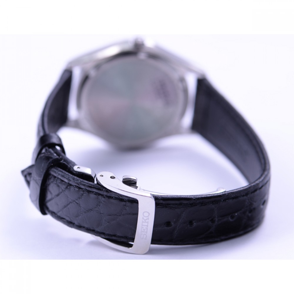 Seiko Dolce SADM009 - men's watch made by Seiko. It has Japanese solar quartz movement and V147 calibre. Titanium, hard coating case of round shape. Case dimensions are 37 mm. in diameter and 8.8 mm. in thickness. The dial of this Seiko watch is white. Display type: analog. This timepiece has sapphire, super clear coating glass. Crocodile leather band, band color: black. 100 m. water resistance. The watch is from Seiko Dolce & Exceline collection. The following features are equipped: antimagnetic, date.