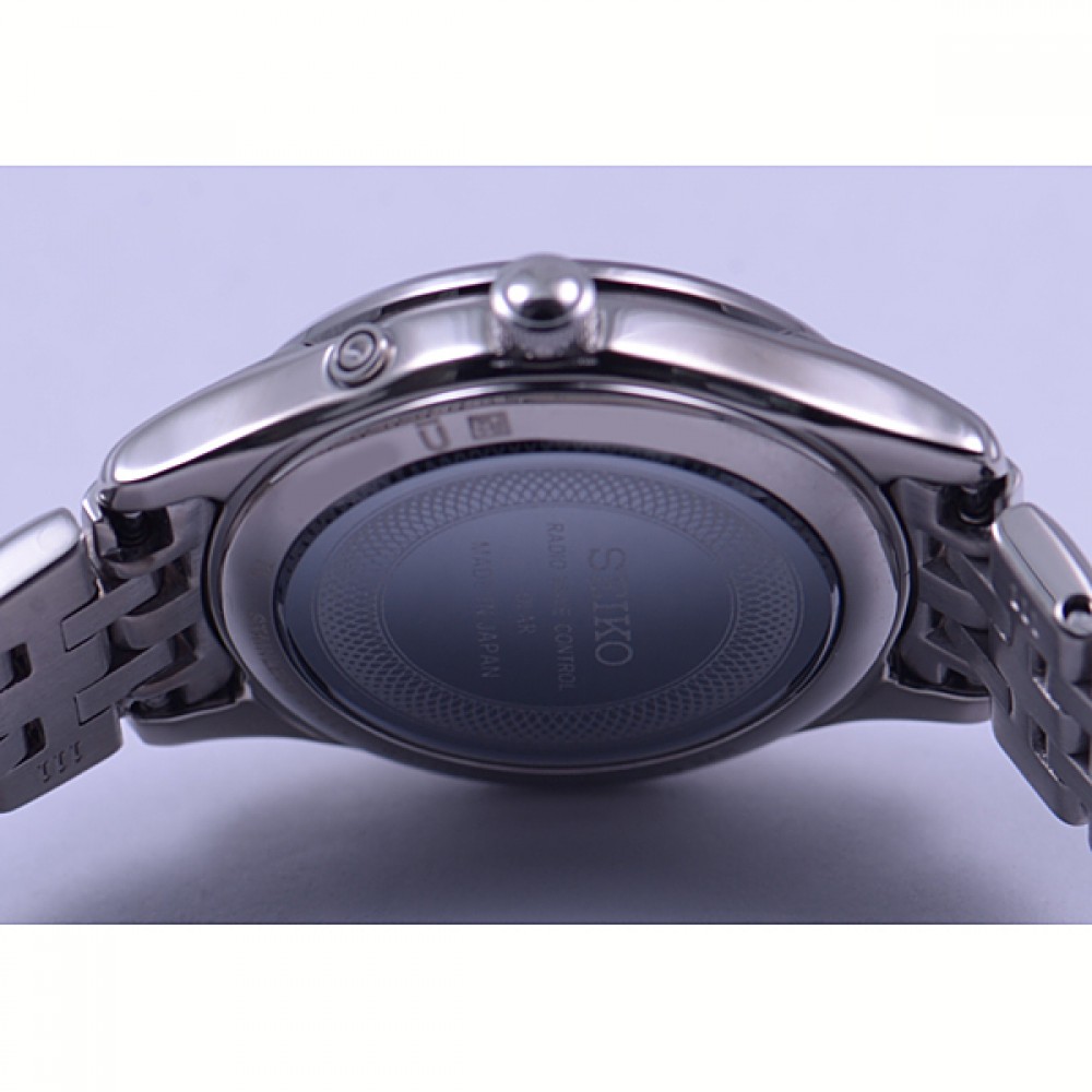 Seiko Exceline SWCW023 - ladies watch produced by Seiko. It has Japanese solar quartz movement and 1B22 calibre. Stainless steel, hard coating case of round shape. Case dimensions are 25.3 mm. in diameter and 7.4 mm. in thickness. The dial of this Seiko watch is silver, white. Display type: analog. This timepiece has sapphire, super clear coating glass. Stainless steel, hard coating band, band color: silver. 100 m. water resistance. The watch is from Seiko Dolce & Exceline collection. The following features are equipped: date, antimagnetic, radio controlled, perpetual calendar.