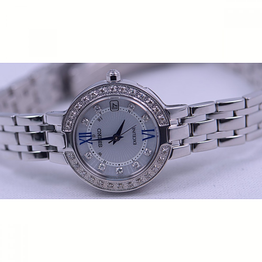 Seiko Exceline SWCW083 - ladies watch manufactured by Seiko. It is equipped with Japanese solar quartz movement and 1B22 calibre. Stainless steel case of round shape. Case dimensions are 25.8 mm. in diameter and 8.7 mm. in thickness. The dial of this Seiko watch is white. Display type: analog. This timepiece has sapphire, super clear coating glass. Stainless steel band, band color: silver. 100 m. water resistance. The watch is from Seiko Dolce & Exceline collection. The following features are equipped: radio controlled, antimagnetic, date, perpetual calendar, diamond set.