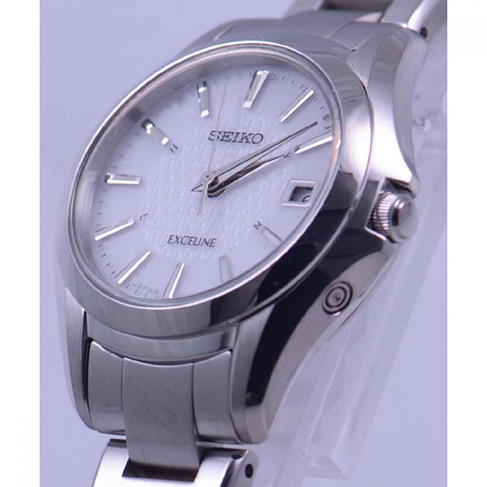 Seiko Exceline SWCW095 - ladies watch made by Seiko. It has Japanese solar quartz movement and 1B22 calibre. Titanium, hard coating case of round shape. Case dimensions are 26.6 mm. in diameter and 8 mm. in thickness. The dial of this Seiko watch is white, silver. Display type: analog. This timepiece has sapphire, super clear coating glass. Titanium, hard coating band, band color: silver. 100 m. water resistance. The watch is from Seiko Dolce & Exceline collection. The following features are equipped: date, radio controlled, perpetual calendar, antimagnetic.