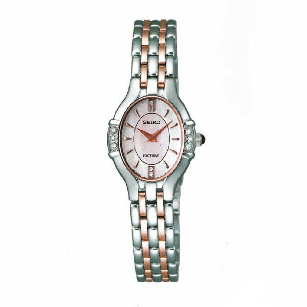 Seiko Exceline SWDX173 - ladies watch manufactured by Seiko. It has Japanese quartz movement and 1F20 calibre. Stainless steel case of oval shape. Case dimensions are 20.4 mm. in diameter and 6.9 mm. in thickness. The dial of this Seiko watch is mother of pearl, pink. Display type: analog. This timepiece has sapphire, super clear coating glass. Stainless steel, gold plated band, band color: silver, gold. 100 m. water resistance. The watch is from Seiko Dolce & Exceline collection. The following features are equipped: antimagnetic, diamond set.