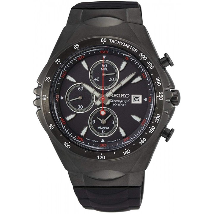 Seiko Giugiaro Design Mackina Sportiva Limited Edition SNAF87PC - men's watch manufactured by Seiko. It has Japanese quartz movement and 7T62 calibre. Stainless steel, hard coating case of round shape. Case dimensions are 43 mm. in diameter and 10 mm. in thickness. The dial of this Seiko watch is black. Display type: analog. This timepiece has hardlex glass. Polymer band, band color: black. 100 m. water resistance. The watch is from Seiko Quartz collection. The following features are equipped: limited edition, glowing hands, glowing markers, date, chronograph, alarm.