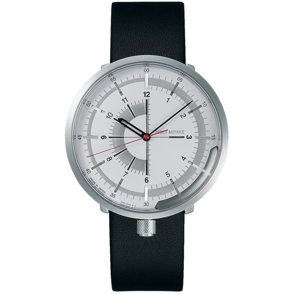 Seiko Issey Miyake One Six NYAK004 - men's watch made by Seiko. It has Japanese automatic movement and NH35 calibre. Stainless steel case of round shape. Case dimensions are 43 mm. in diameter and 11.1 mm. in thickness. The dial of this Seiko watch is white. Display type: analog. This timepiece has hardlex glass. Leather band, band color: black. 50 m. water resistance. The watch is from Issey Miyake collection. The following features are equipped: antimagnetic.