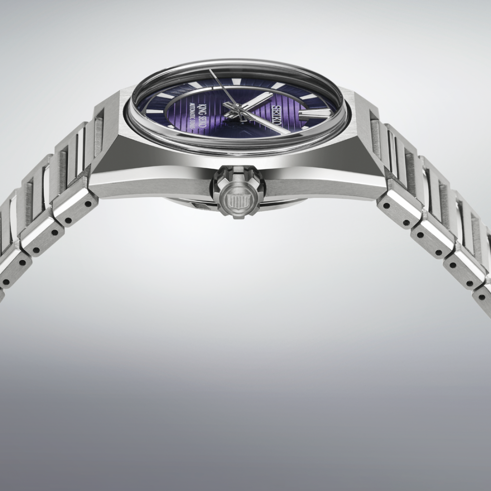 Seiko King Seiko VANAC HKF001J - men's watch made by Seiko. It is equipped with Japanese automatic movement and 8L45 calibre. Titanium case of round shape. Case dimensions are 41 mm. in diameter and 14.3 mm. in thickness. The dial of this Seiko watch is purple. Display type: analog. This timepiece has sapphire, antireflection coating glass. Titanium band, band color: silver. 100 m. water resistance. The watch is from King Seiko collection. The following features are equipped: antimagnetic, date, screw-down crown, glowing hands, glowing markers.