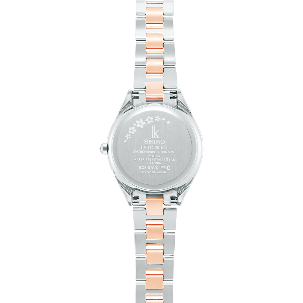 Seiko Lukia 2022 Sakura Blooming Limited Model SSQV102 - ladies watch manufactured by Seiko. It has Japanese solar quartz movement and 1B35 calibre. Titanium, hard coating, gold plated case of round shape. Case dimensions are 28.28 mm. in diameter and 7.6 mm. in thickness. The dial of this Seiko watch is mother of pearl. Display type: analog. This timepiece has sapphire, super clear coating glass. Titanium, hard coating, gold plated band, band color: silver, gold. 100 m. water resistance. The watch is from Seiko Lukia collection. The following features are equipped: antimagnetic, glowing hands, limited edition, date, radio controlled, perpetual calendar, diamond set, world time.