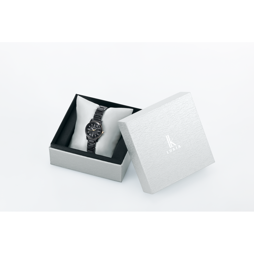 Seiko Lukia Debut Limited Model SSQV084 - ladies watch made by Seiko. It is equipped with Japanese solar quartz movement and 1B35 calibre. Titanium, hard coating case of round shape. Case dimensions are 28 mm. in diameter and 7.6 mm. in thickness. The dial of this Seiko watch is black. Display type: analog. This timepiece has sapphire, super clear coating glass. Titanium, hard coating band, band color: black. 100 m. water resistance. The watch is from Seiko Lukia collection. The following features are equipped: antimagnetic, radio controlled, glowing hands, date, perpetual calendar, world time, diamond set, limited edition.