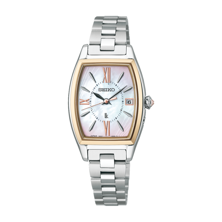 Seiko Lukia Grow SSQW076 - ladies watch manufactured by Seiko. It is equipped with Japanese solar quartz movement and 1B32 calibre. Titanium, diamond shield case of tonneau shape. Case dimensions are 24.6 mm. in diameter and 8.3 mm. in thickness. The dial of this Seiko watch is mother of pearl. Display type: analog. This timepiece has sapphire, super clear coating glass. Titanium band, band color: silver. 100 m. water resistance. The watch is from Seiko Lukia collection. The following features are equipped: radio controlled, perpetual calendar, date, crystal set, antimagnetic.