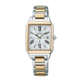 Seiko Lukia Grow SSVW210 - ladies watch made by Seiko. It is equipped with Japanese solar quartz movement and 1B32 calibre. Stainless steel, diamond shield case of rectangle shape. Case dimensions are 23.9 mm. in diameter and 7.7 mm. in thickness. The dial of this Seiko watch is white. Display type: analog. This timepiece has sapphire, super clear coating glass. Stainless steel, gold plated band, band color: silver, gold. 100 m. water resistance. The watch is from Seiko Lukia collection. The following features are equipped: radio controlled, perpetual calendar, date, antimagnetic, crystal set.