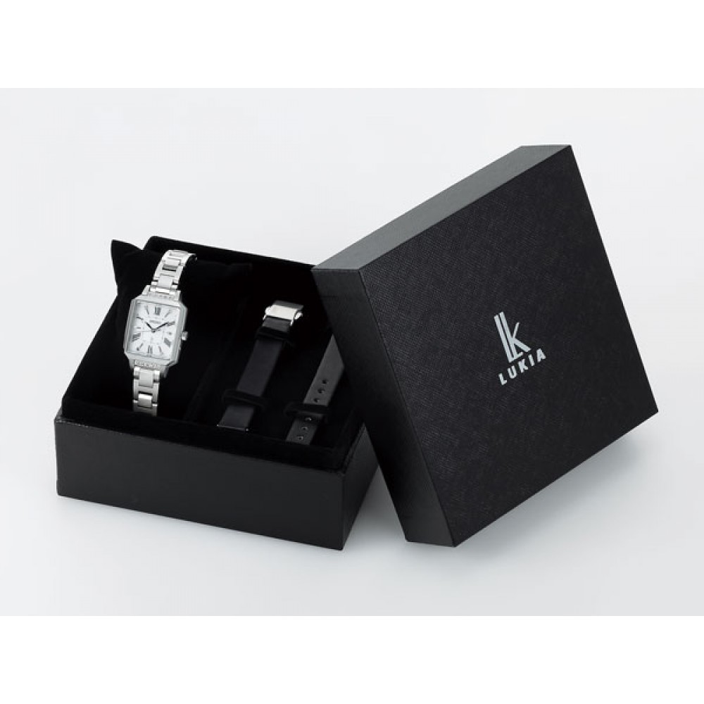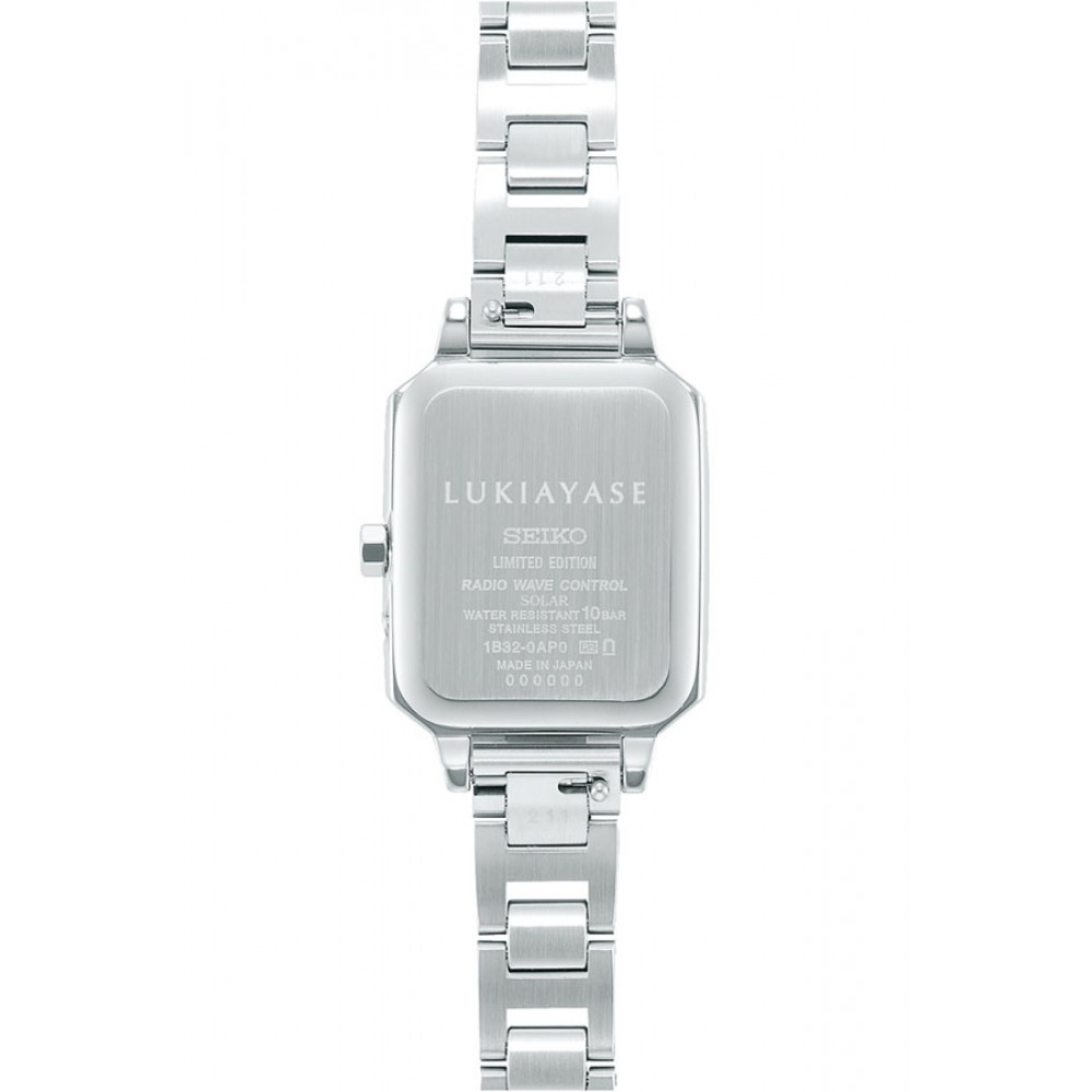 Seiko Lukia LUKIAYASE LUKIA 25th Anniversary Limited Edition SSVW177 - ladies watch produced by Seiko. It is equipped with Japanese solar quartz movement and 1B32 calibre. Stainless steel case of rectangle shape. Case dimensions are 23.9 mm. in diameter and 7.7 mm. in thickness. The dial of this Seiko watch is silver. Display type: analog. This timepiece has sapphire, super clear coating glass. Stainless steel, leather band, band color: silver, black. 100 m. water resistance. The watch is from Seiko Lukia collection. The following features are equipped: date, antimagnetic, radio controlled, limited edition, diamond set, perpetual calendar.