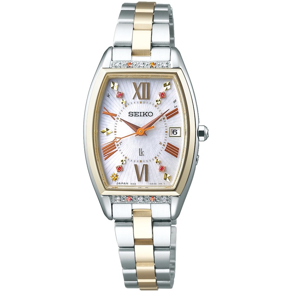 Seiko Lukia Pierre ・ Erme Produce Limited Model SSVW152 - ladies watch produced by Seiko. It has Japanese solar quartz movement and 1B32 calibre. Stainless steel, hard coating, gold plated case of tonneau shape. Case dimensions are 23.9 mm. in diameter and 7.7 mm. in thickness. The dial of this Seiko watch is white. Display type: analog. This timepiece has sapphire, super clear coating glass. Stainless steel, hard coating, gold plated band, band color: silver, gold. 100 m. water resistance. The watch is from Seiko Lukia collection. The following features are equipped: antimagnetic, date, limited edition, diamond set, perpetual calendar, radio controlled.